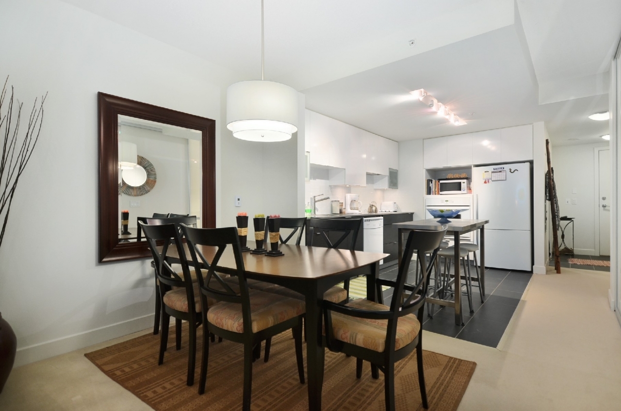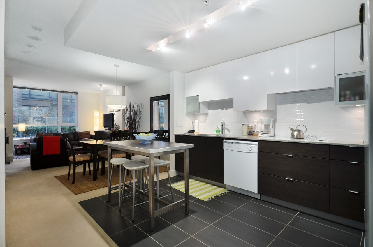 Ground level one bedroom & den at VENTANA. This premier building, built by Intracorps(2008), combines modern finishes such as high end cabinetry, appl's, quartz c/t & subway tiles w/superior open flow design to produce an appealing & modern choice for today's discerning buyer. This suite features insuite laundry & storage, an electric f/P, floor to ceiling windows, an extra large south facing raised patio & an exercise & private lounge w/ billiard table at ground level just outside your door. This prime location at the centre of Lower Lonsdale is only steps away from many fine shops, restaurants, bistros, the seabus, theatre, John Braithwaite Comm Centre, North Vancouver Pier, various parks & much more.