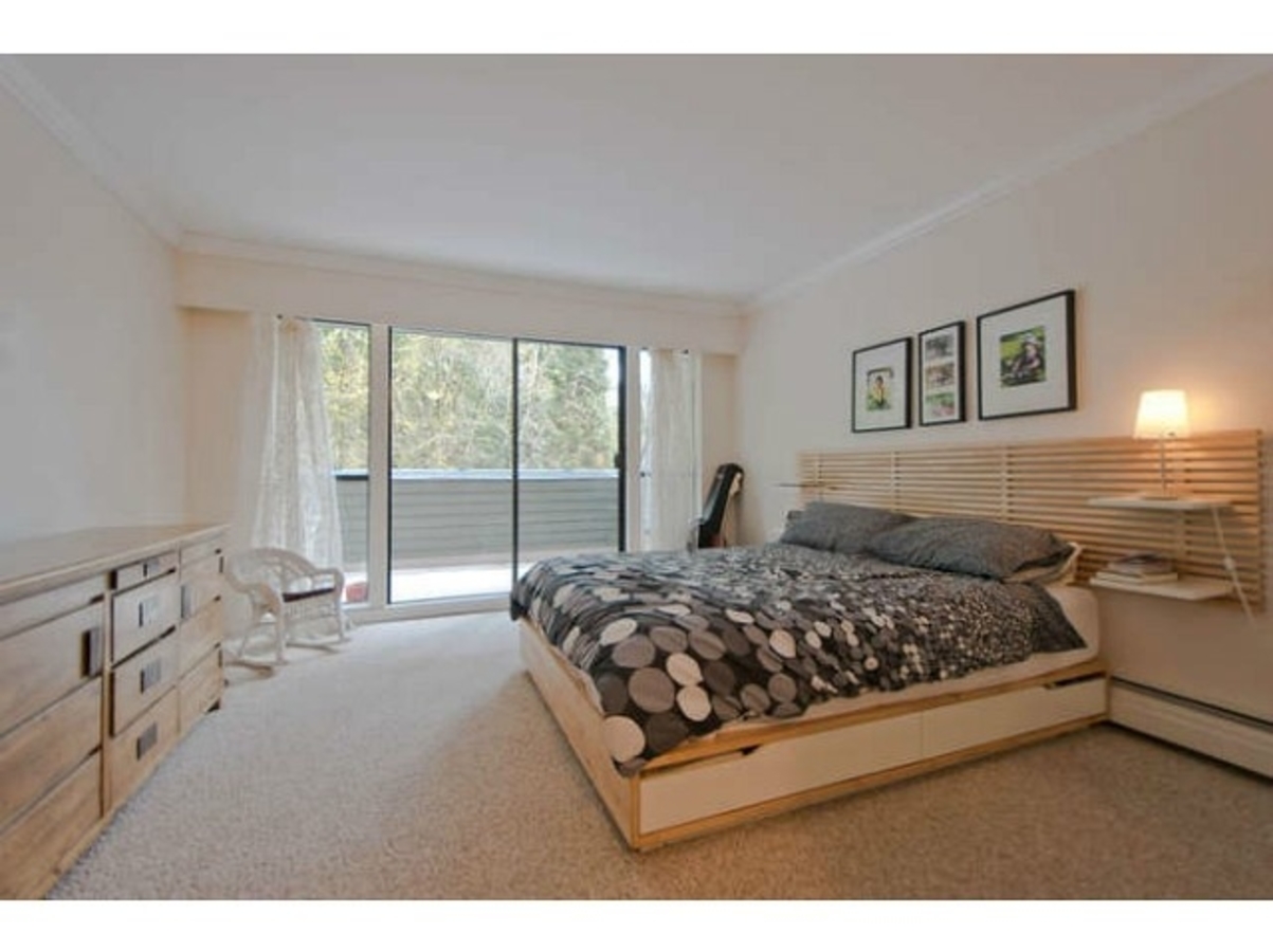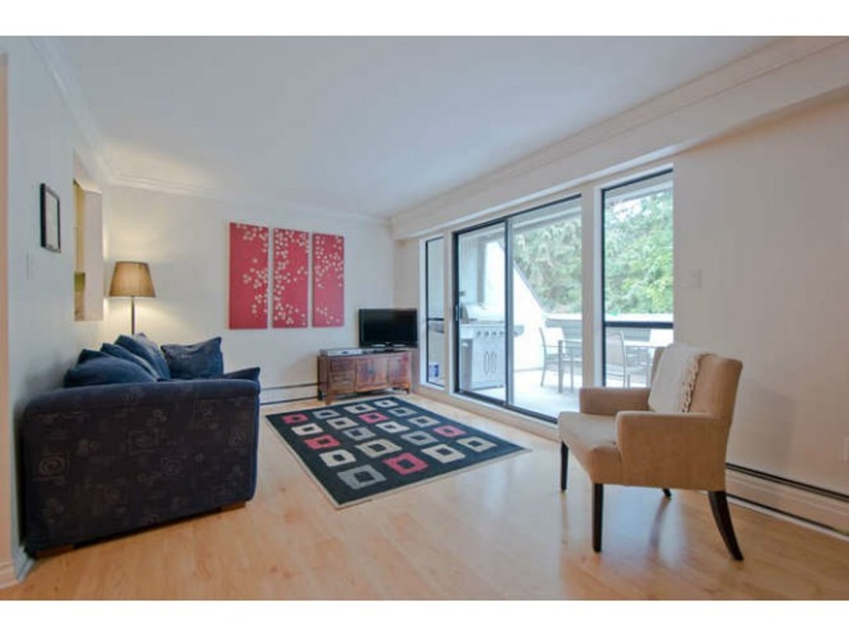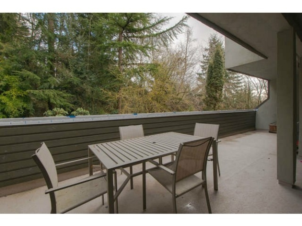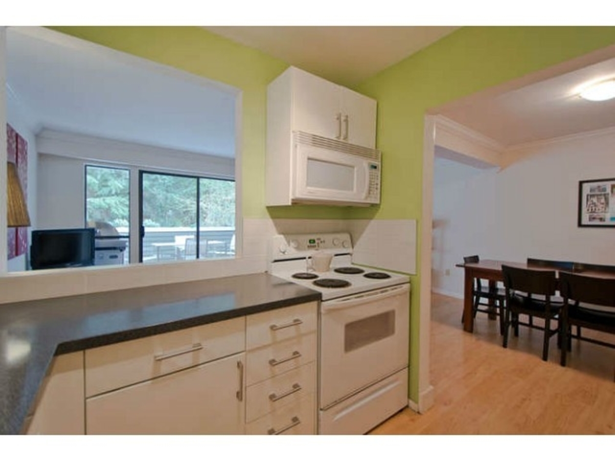 The best 2 bed floor plan in the complex: tons of storage & the master has an ensuite powder room. Updates throughout: kitchen (2010), both washrooms, laminate floors, crown mouldings & more. The massive deck (w/ new membrane) stretches the full length of the condo, perfect for BBQ's! Plus it faces out over trees - very private! Covered parking. A well managed complex that has a pool & a bike room & is close to everything great about the North Shore: trails, biking & skiing. Nothing needs to be done in this fabulous unit, come check out your new home in the trees.